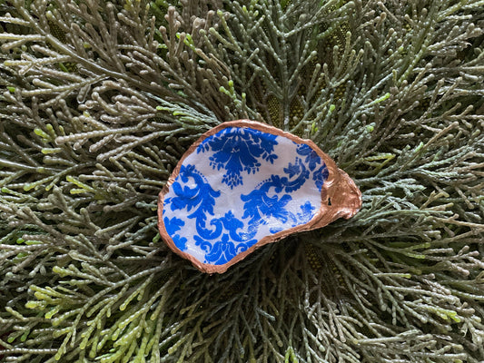 Blue and white Chinoiserie decoupaged oyster shell trivet dish/jewelry tray