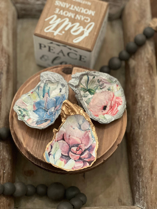 Decoupaged succulent floral Oyster trivet/jewelry tray
