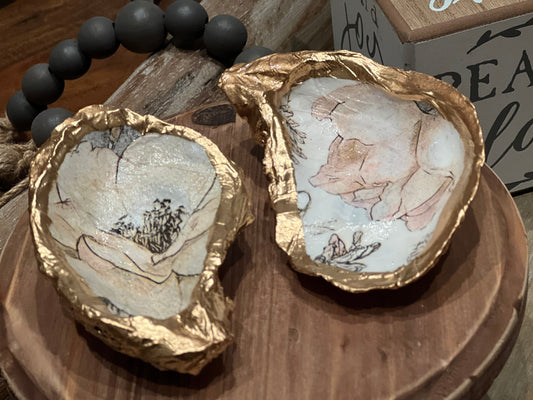 Decoupage and hand painted oyster shell trinket dish/jewelry tray