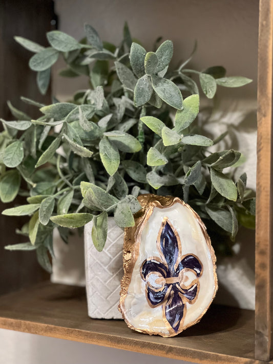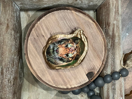 Tiger decoupaged and Hand painted gold leaf trimmed authentic Louisiana oyster trivet dish/jewelry tray