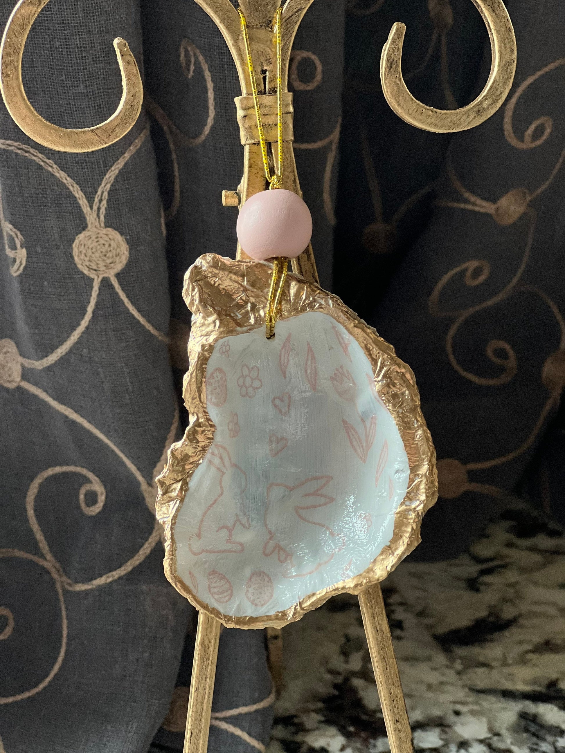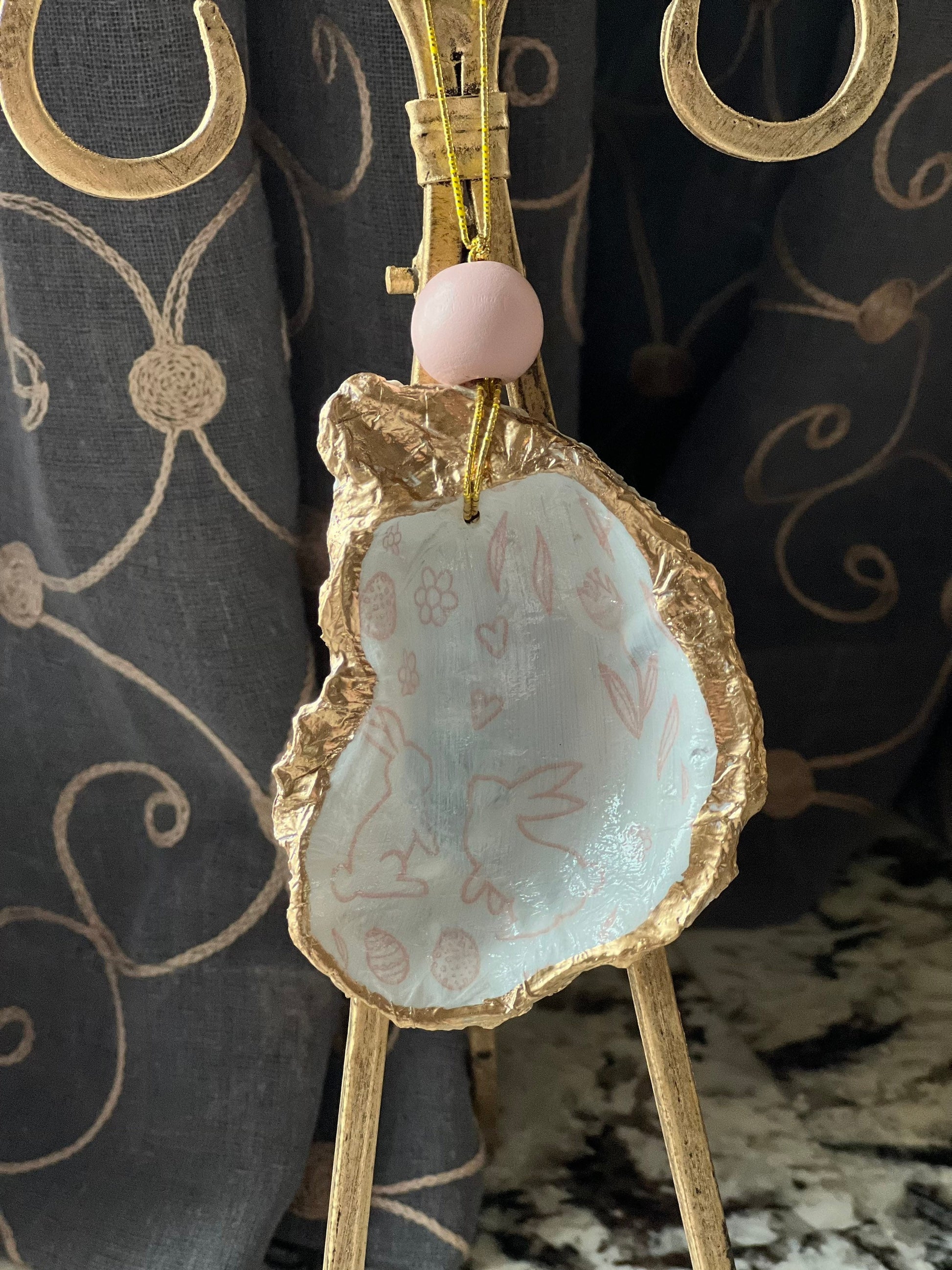 Light pink and white Easter print decoupaged, Hand painted gold leaf trimmed authentic Louisiana oyster shell ornament with light pink bead