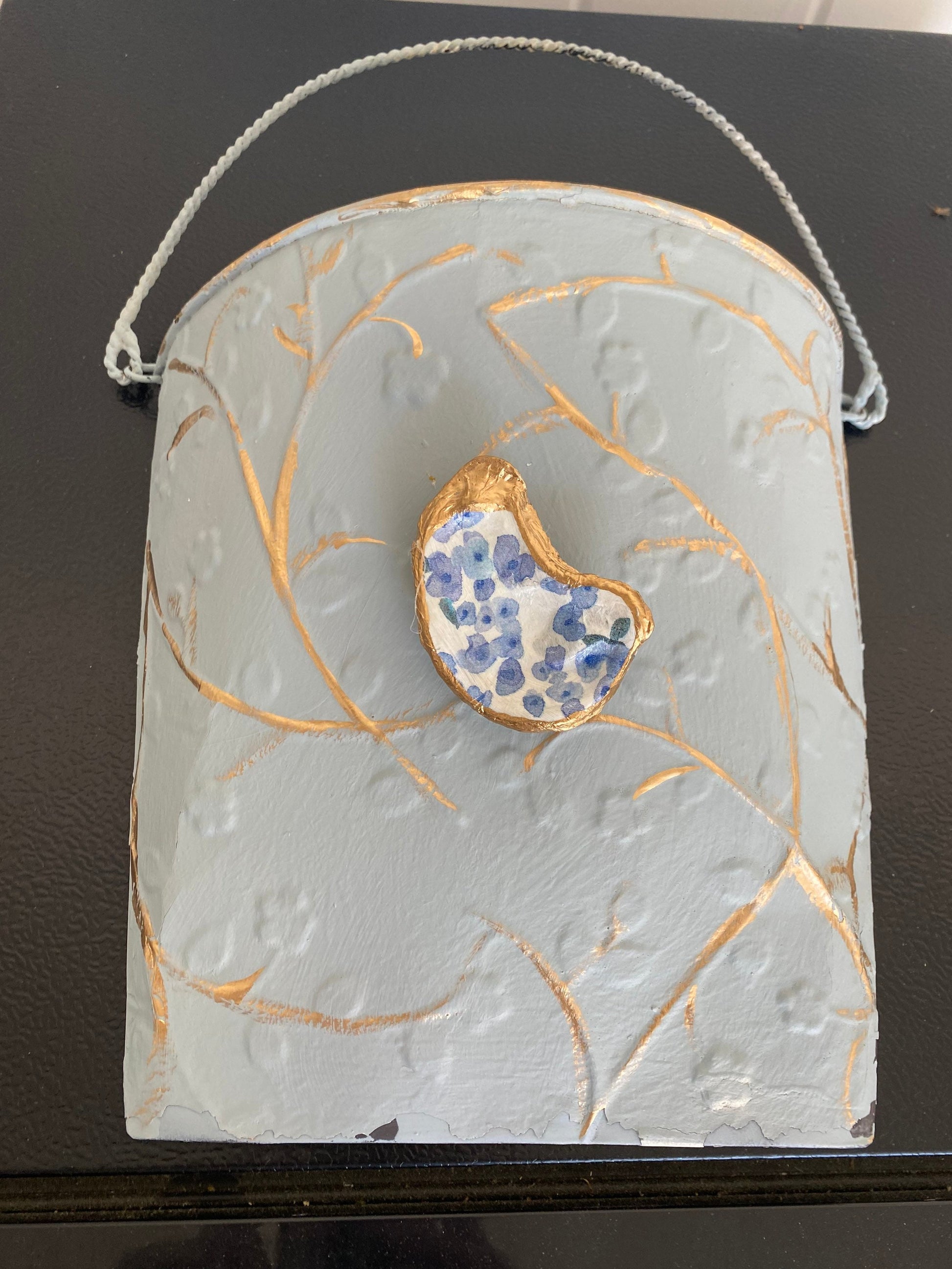 Blue floral decoupaged and Gilded authentic Louisiana oyster mounted on a light slate blue and gold distressed tin wall planter.